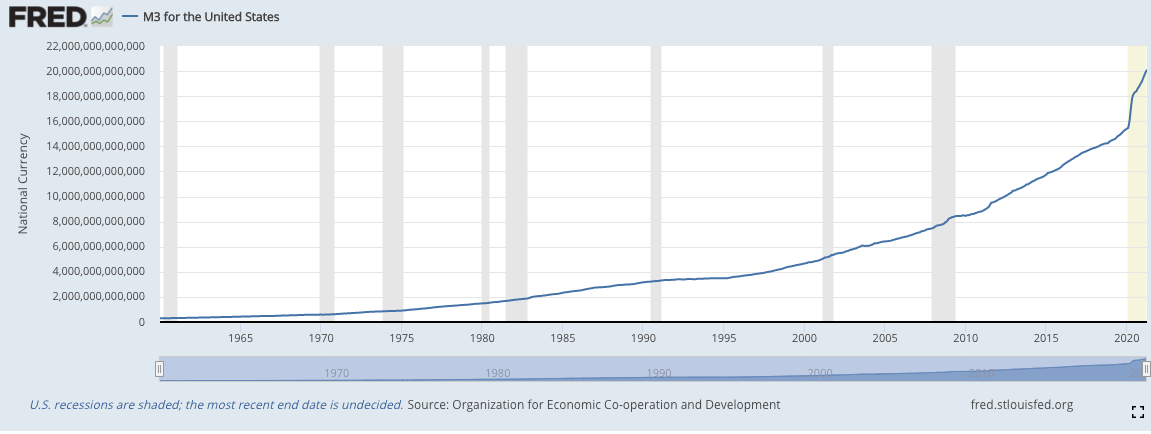 Amidst the rat race, we are collectively told that one ought to be prudent with their finances, live within their means, and save for a rainy day. However, once obtained, our money because less and less useful as inflation chips away at its purchasing power. Hence bring us into contact with point number two. On a purely nominal basis, the amount of money and ‘near money’ assets in the system – taking America as an example – has increased substantially in the postwar period. For example, the following is the growth trajectory of M3 – the loosest of the major money supply metrics – for the United States.4