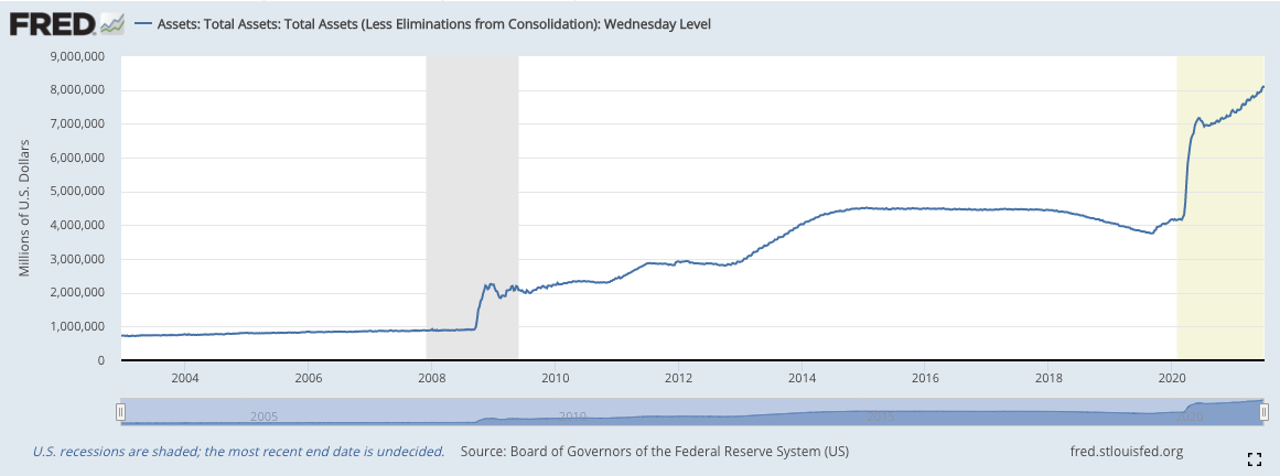 Rather than the proverbial printing of money, or debasing of the currency, what’s really happened is that assets have become increasingly monetizable. In short, it is easier today for institutions to convert non-cash assets into cash via central bank mechanisms, than in previous decades. If you look at the M3 figure above you will notice that once the US got off the gold standard in the early 1970s, the line began to climb in earnest. The reason being that if the money supply was constrained by the size of the underlying gold reserve, then there would only be so much cash that could be produced via the purchasing of the precious metal. Once the US kicked gold to the curb though, it became possible for the Federal Reserve to accept assets other than gold in exchange for cash. If we think back to the Great Recession we see this in the way in which the Fed provided liquidity to financial institutions in exchange for certain financial instruments such as mortgage-backed securities. Thus, it is not the case that the Fed printed money out of thin air but that the central bank exchanged liquid assets (cash) for less liquid assets of the same worth. The following shows this absorption of assets in the form of the Fed’s balance sheet:5
